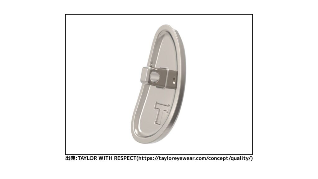 テイラーのパッドは、すべてチタンパッドでできています。何と言ってもチタンパッドは軽いです。しかも、耐食性、腐食性に強く長く使えます。ただし、汗をかくと滑りやすくなるのが難点です。夏場は、メガネがズレやすくなるのがデメリットです。しかし、軽いので軽さでカバーできるかもしれません。