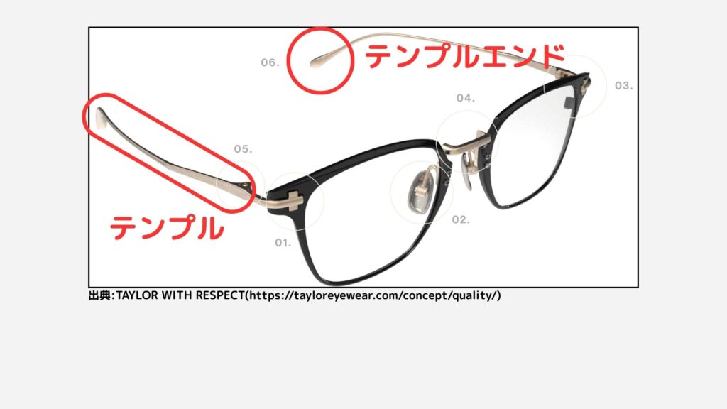 かけ心地の肝となっているのはテンプルです。テンプルとは耳に引っ掛けてメガネを固定する部分のところです。「つる」と言われるところです。